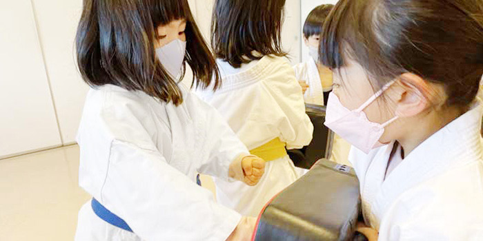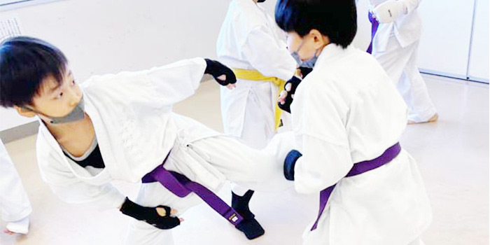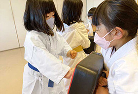 新規ご入会いただく方へは、ミットを使った練習や組手稽古時の安全対策として最初に男女共通で拳サポーター、膝サポーター、脛サポーター、ヘッドガード、男子のみファールカップ、女子はチェストガードを必ずご購入いただきます。