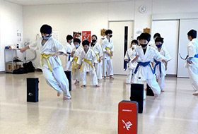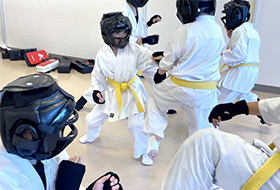 新規ご入会いただく方へは、ミットを使った練習や組手稽古時の安全対策として最初に男女共通で拳サポーター、膝サポーター、脛サポーター、ヘッドガード、男子のみファールカップ、女子はチェストガードを必ずご購入いただきます。